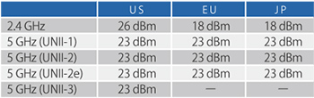 | Note | 各国電波規制に基づいて以下に示すUNIIバンドで許可される最大送信電力は、ファームウェアで制限されています。 |